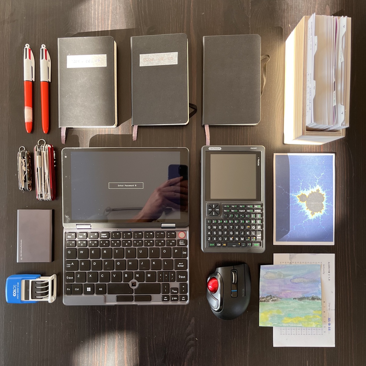 Mano kasdienis mažųjų įrankių rinkinys (every day carry arba EDC), pritaikytas ir studijai, ir kelionėms. Prie jo dažnai pridedamas ir vienas iš pagrindinių nešiojamų kompiuterių (darbo kontraktams Macbook, saviems projektams ThinkPad arba Macbook). Nuotraukoje matomi daiktai iš eilės: -...