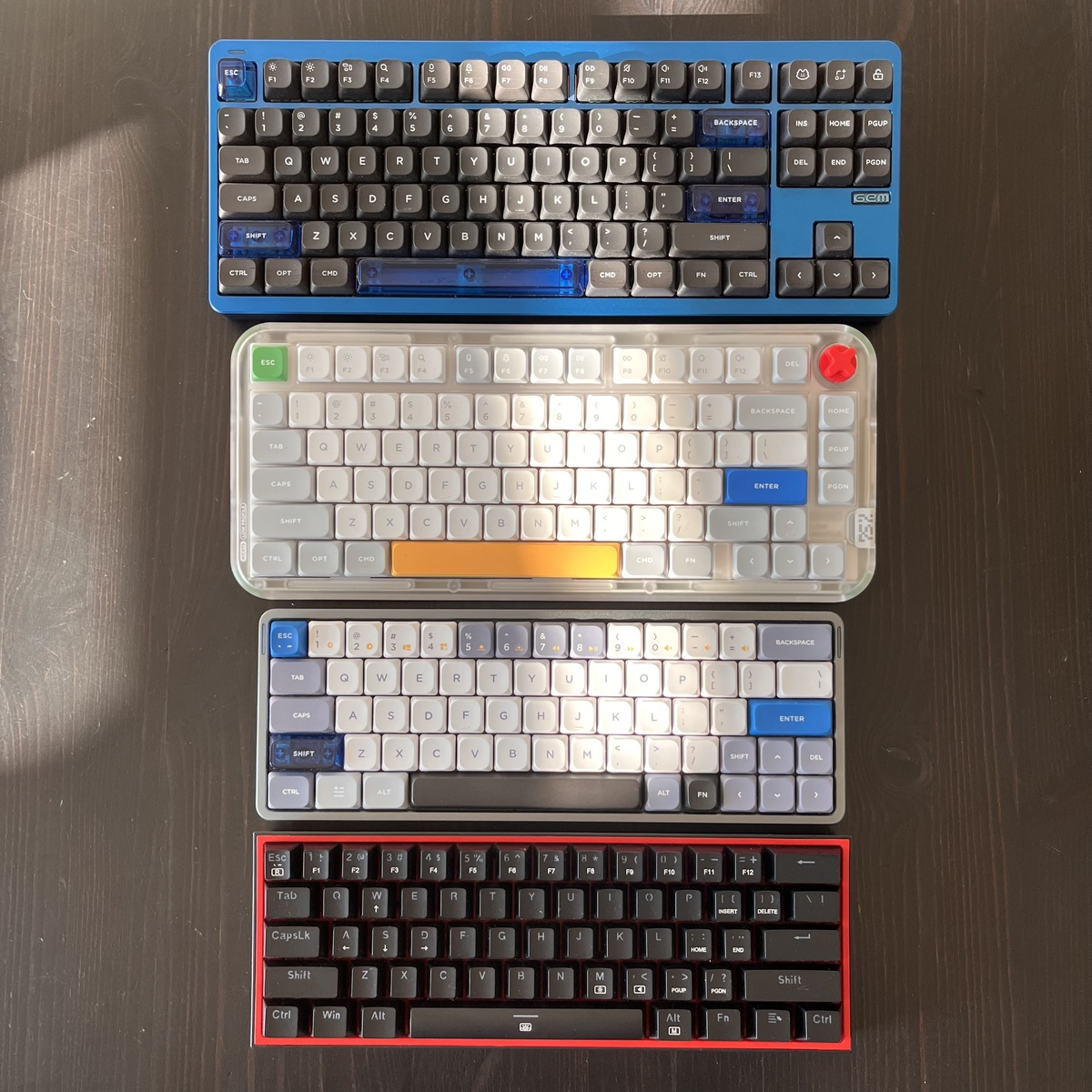 Mano mechaninės klaviatūros 2025 metais, visos naudojamos su skirtingais kompiuteriais arba rotuojant dėl smagumo.