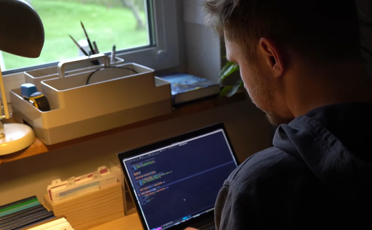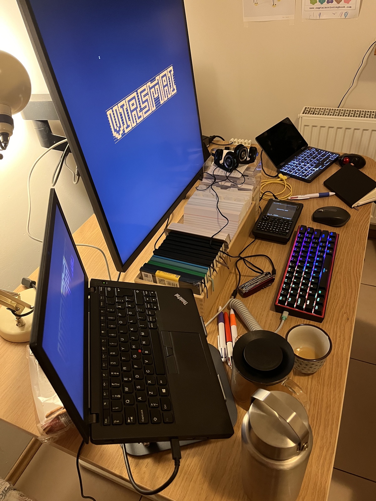 Mokytis programuoti Rust paskatino senuku tapęs ThinkPad X270, kurį atnaujinęs naudojau nuo 2023 metų. Nuotraukoje chaotiškas darbo stalas su LG DualUp ir keliais kitais daikčiukais.